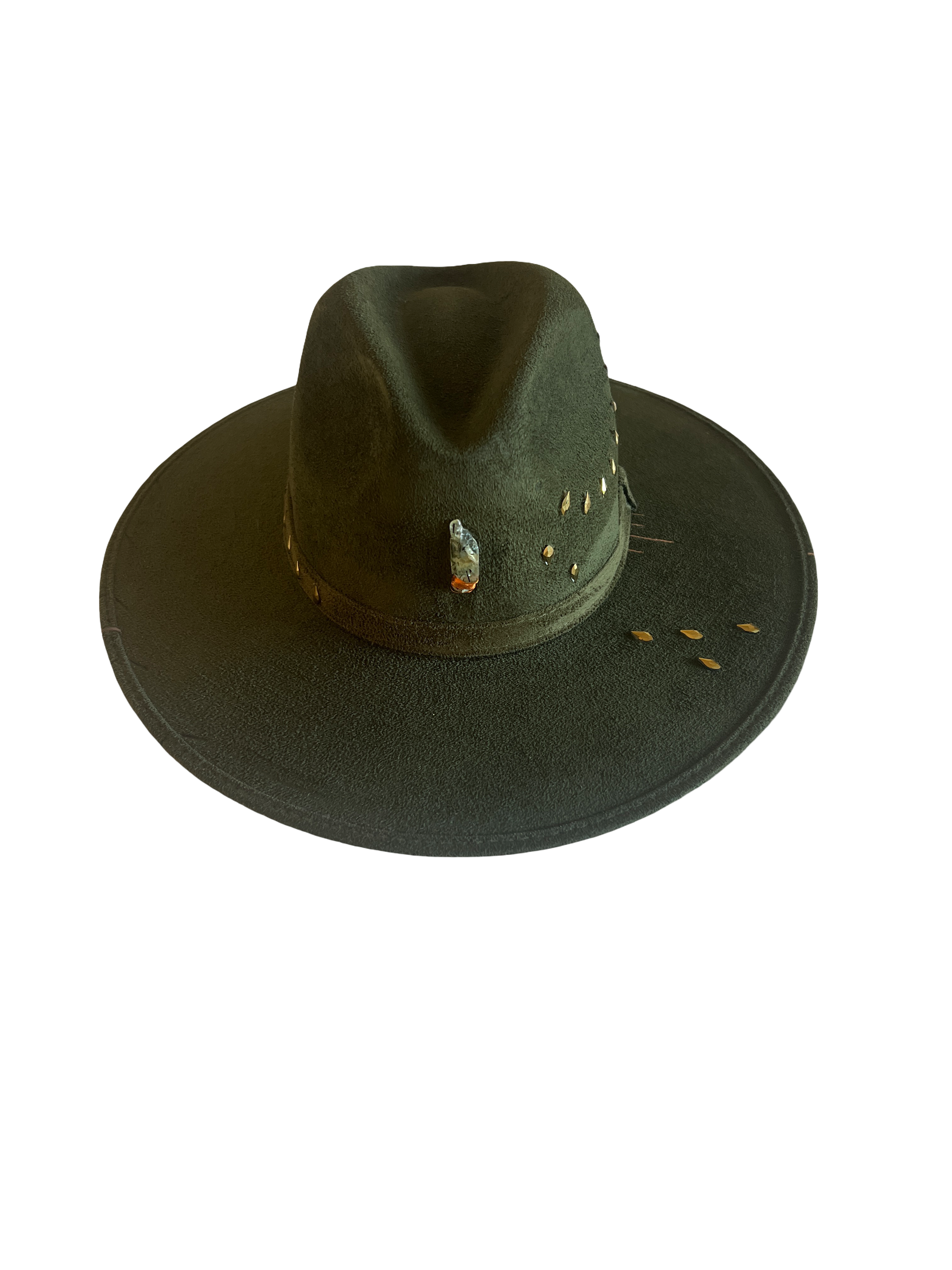 Sombrero de gamuza fina y ligera, color verde militar, cristales gota de agua, cristal de cuarzo natural Prehnite.