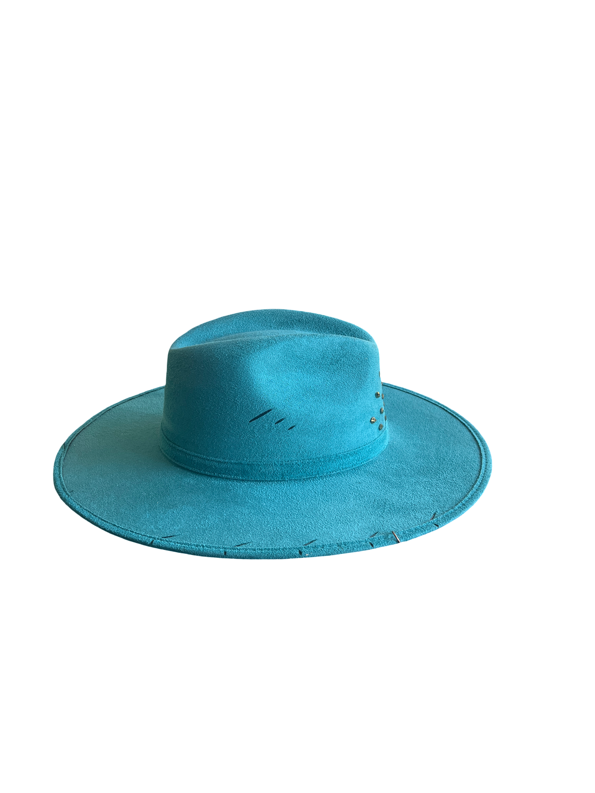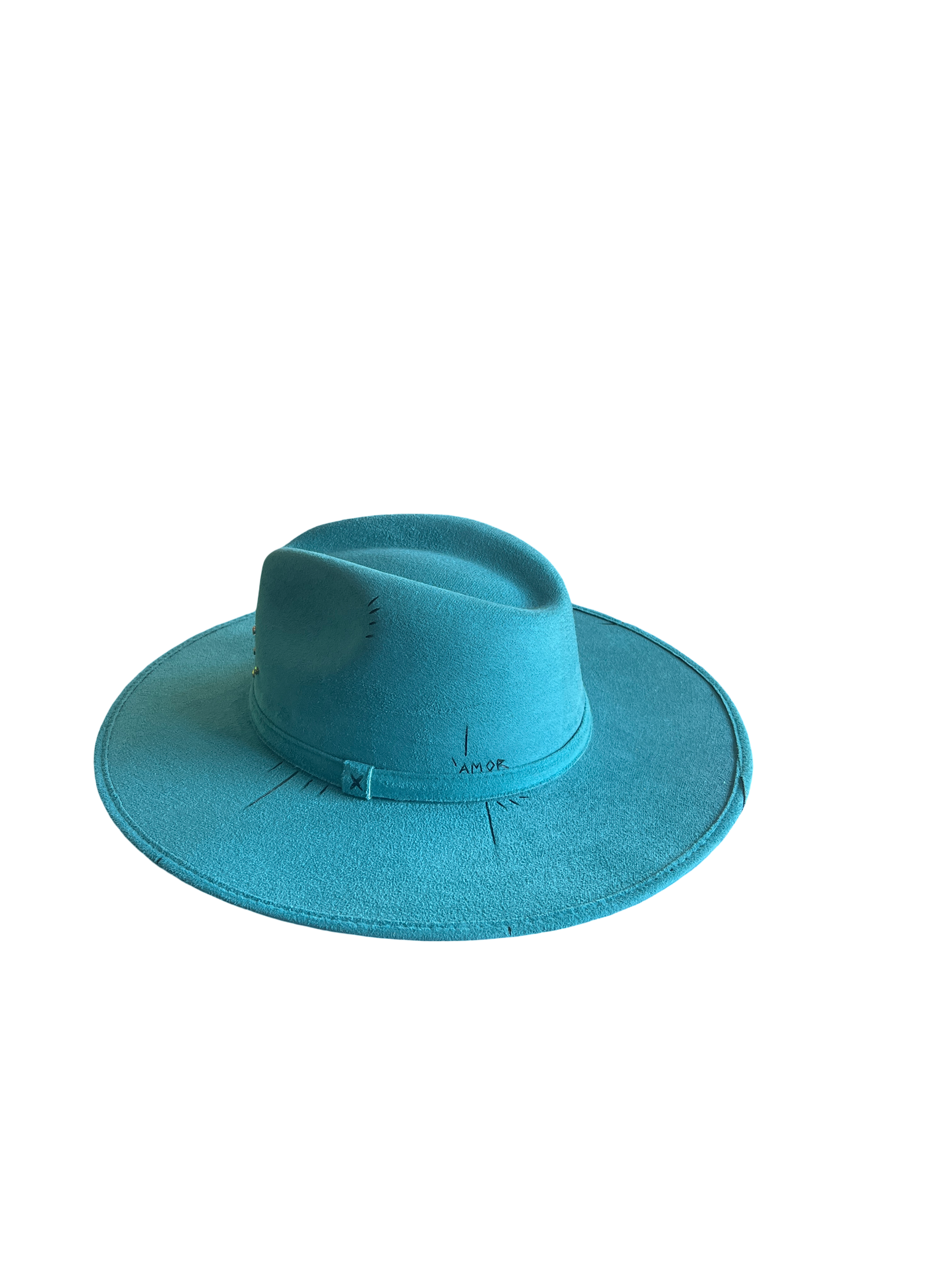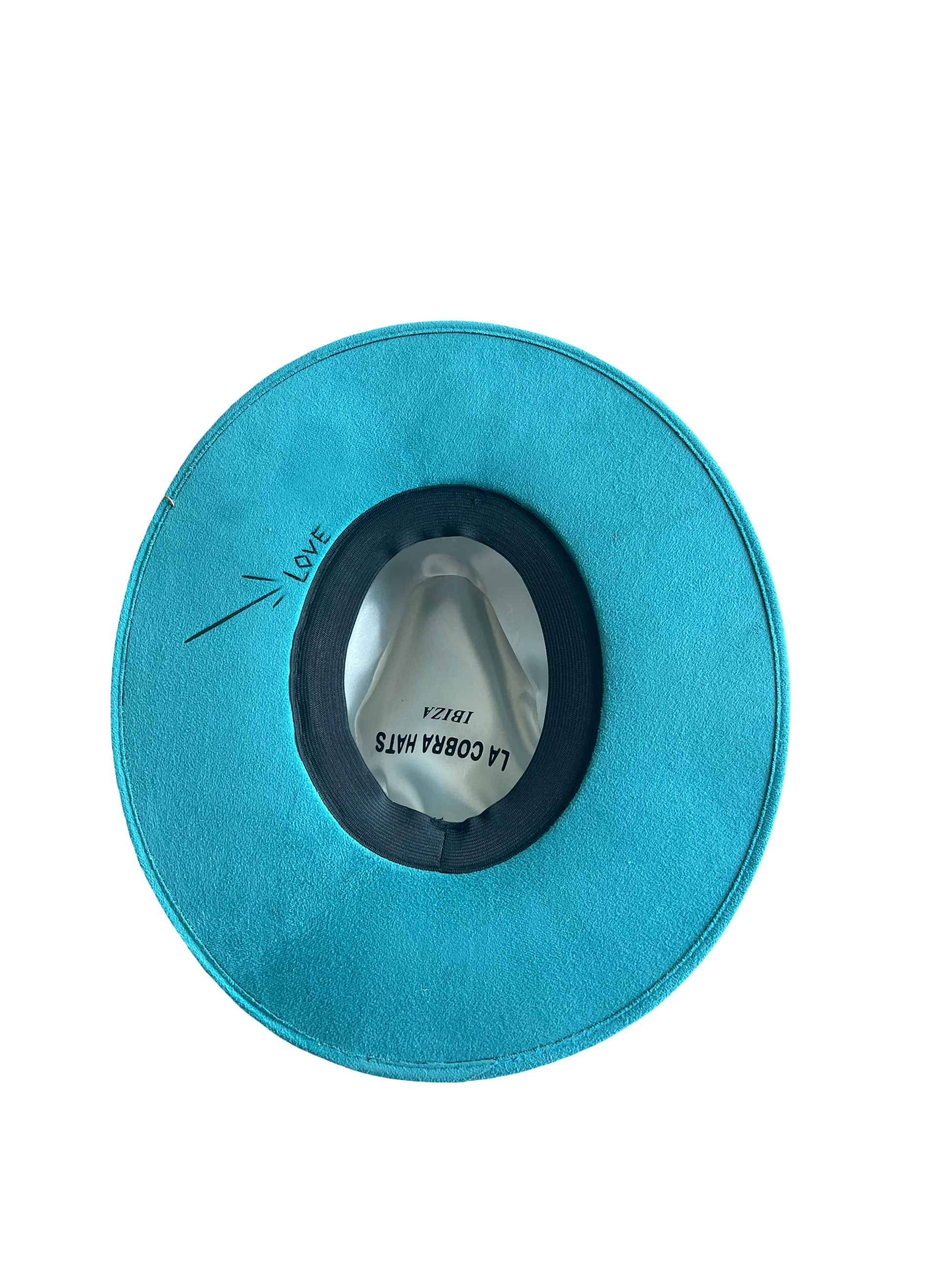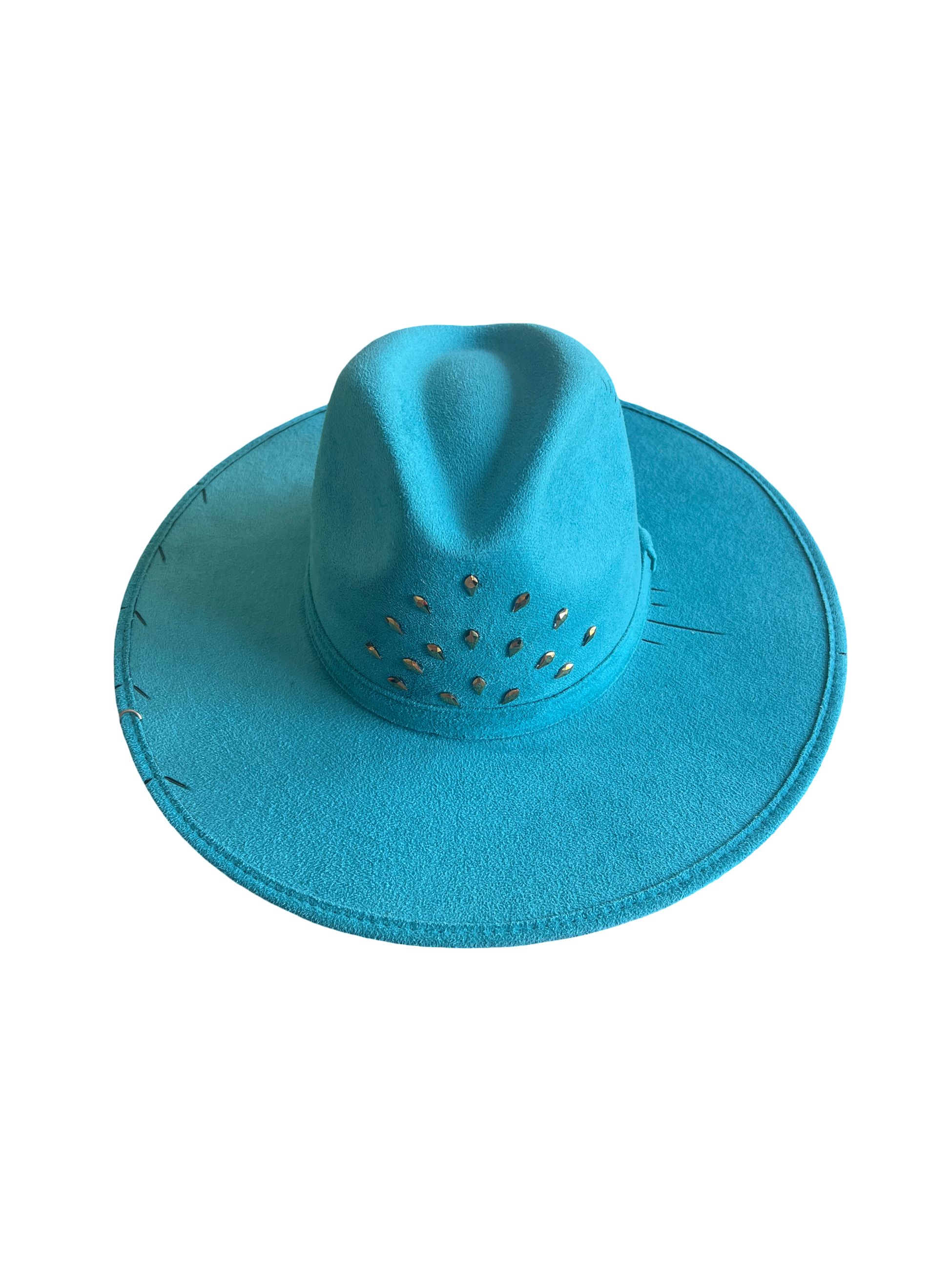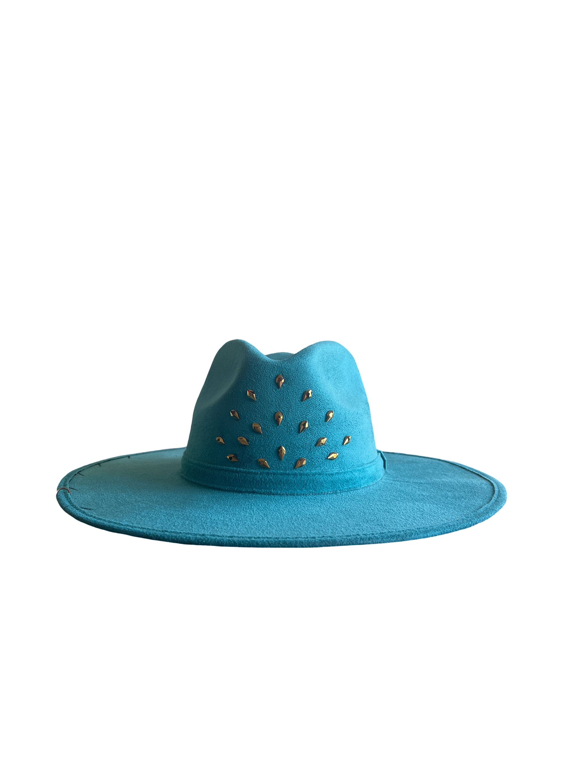 Sombrero de gamuza fina y ligera, cristales gota de agua dorados.