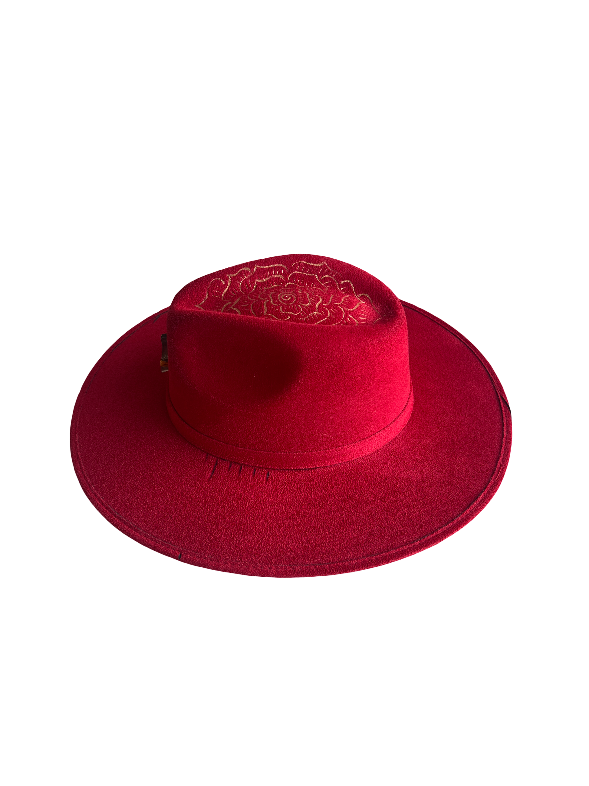 Sombrero de gamuza fina y ligera, color rojo, flor de loto pintada en oro viejo, cristal de cuarzo natural oro viejo.
