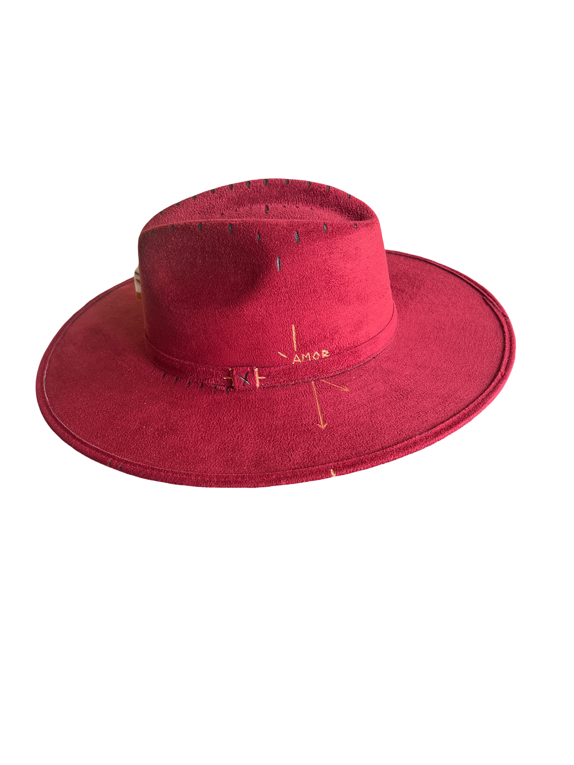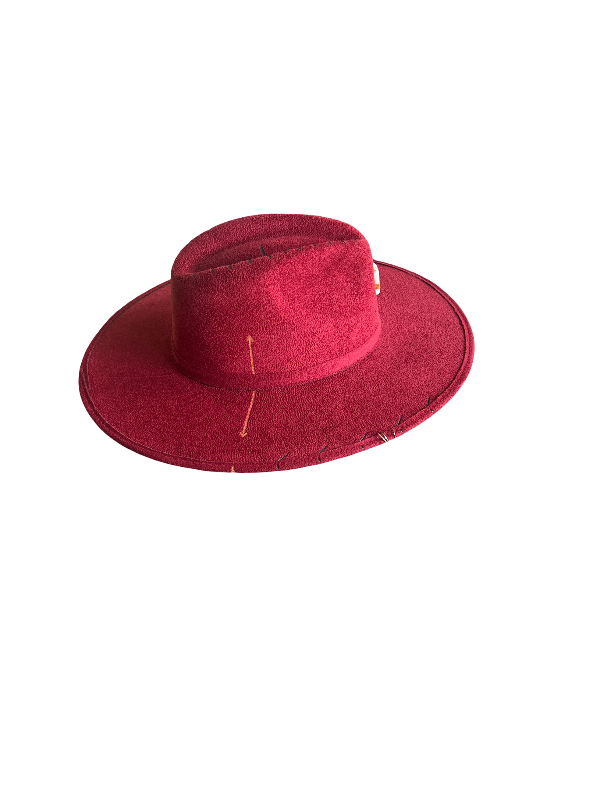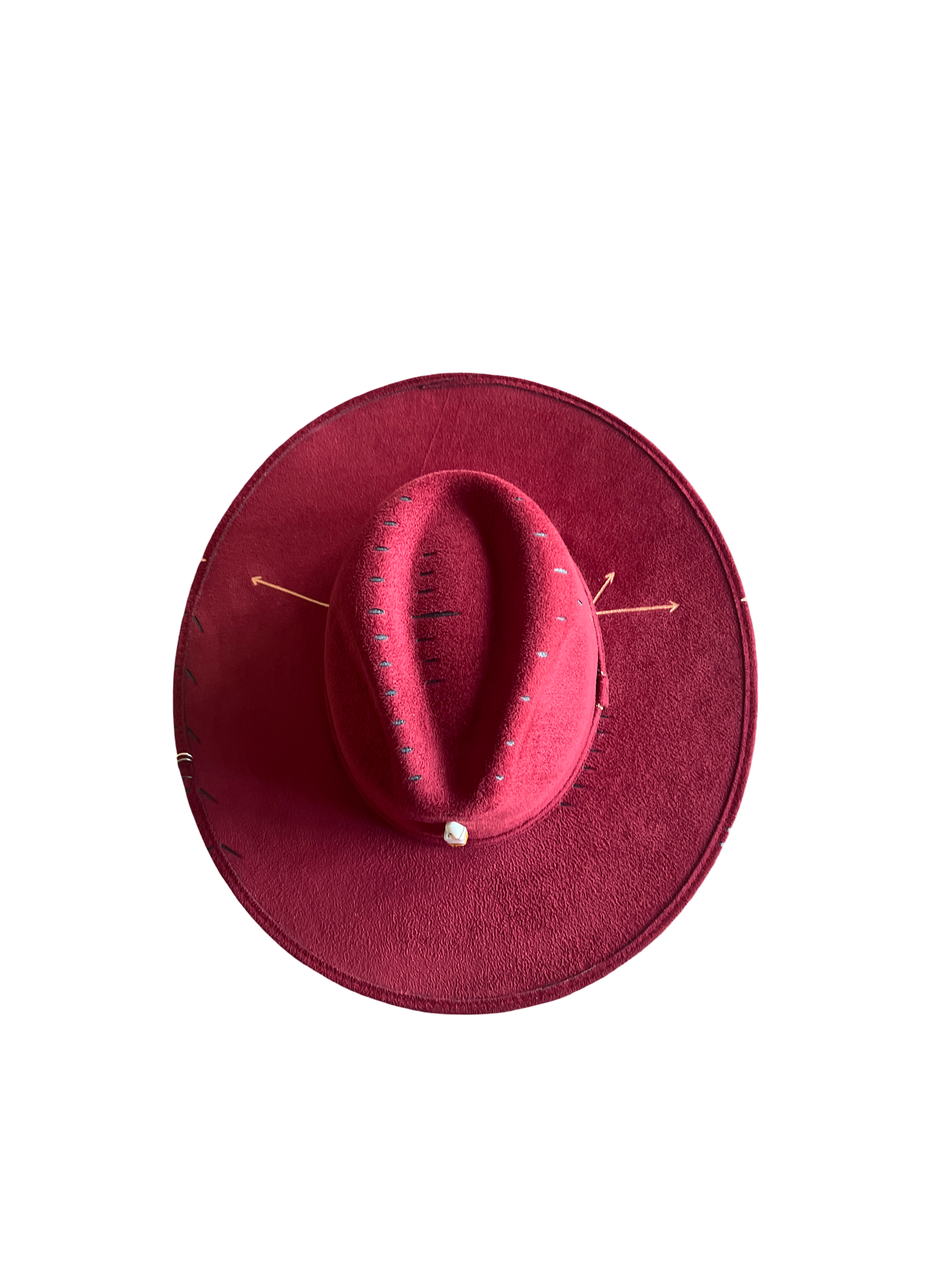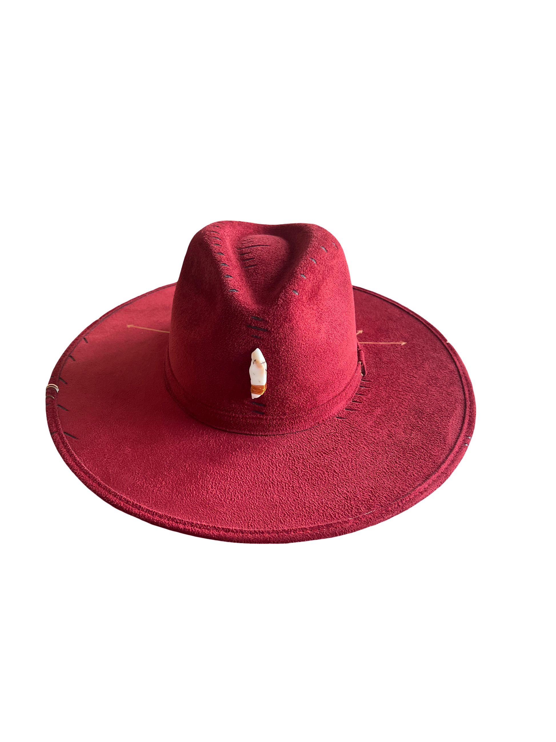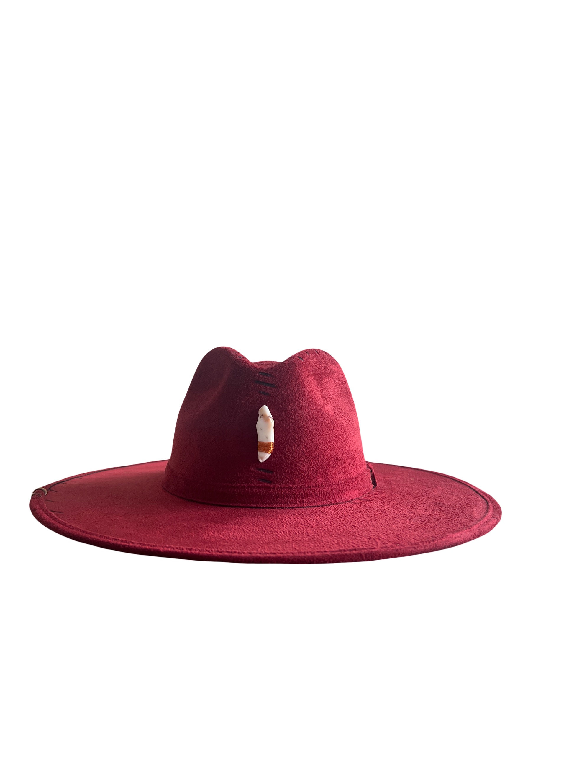 Sombrero de gamuza fina y ligera, color rojo granate, cristal de cuarzo Ágata