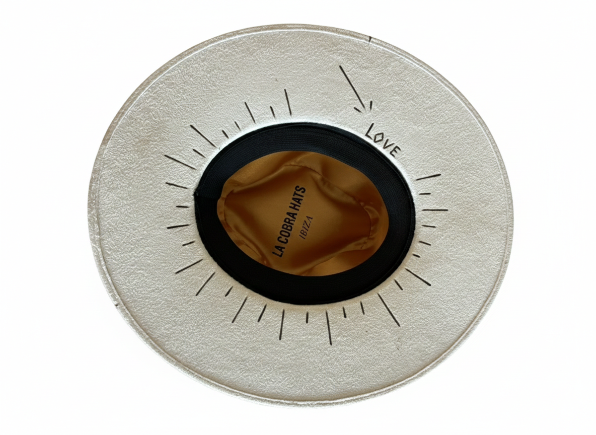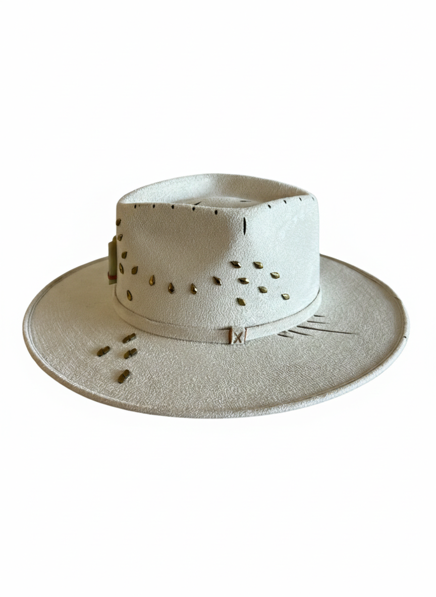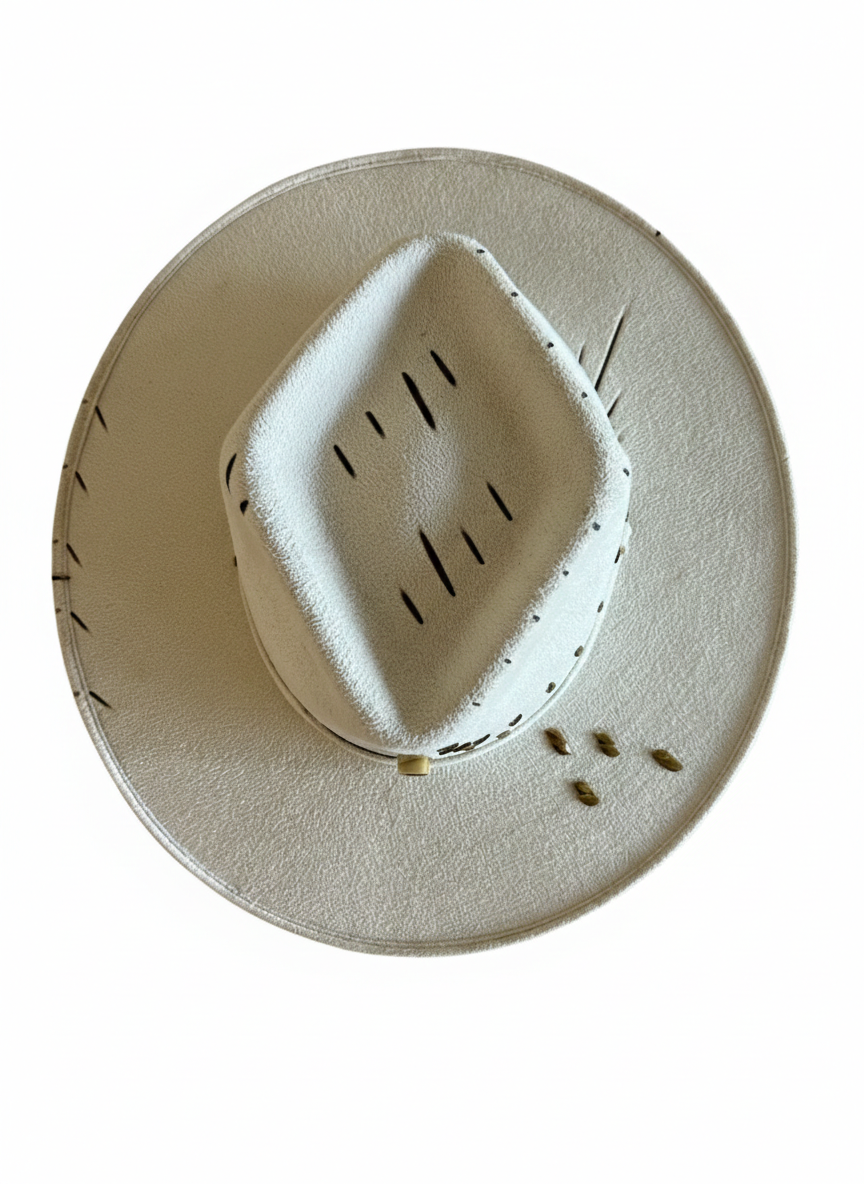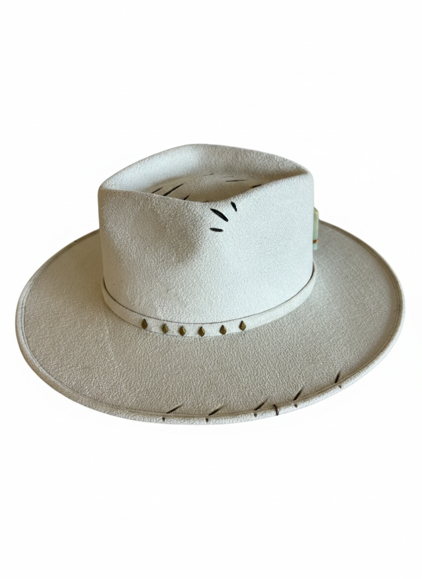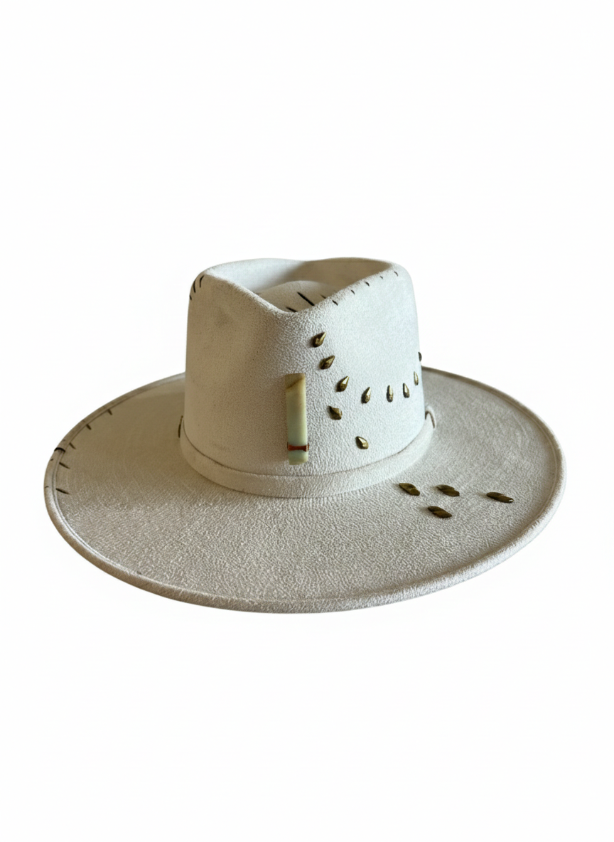 Sombrero copa rombo blanco hueso, diseño con cristales dorados y cuarzo Amazonita